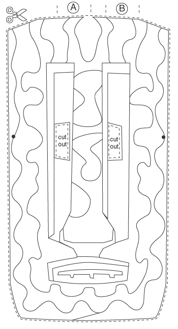 Cut on dotted lines, paste top-horns where marked, and don't forget to tie string on side tabs.